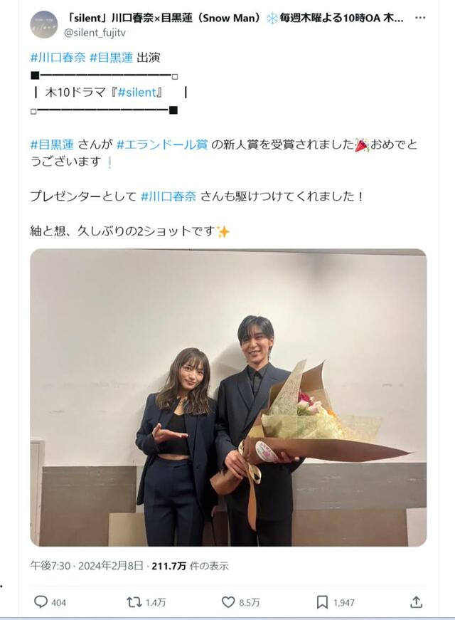 「川口春奈の"最高の相手役"」ランキング、横浜流星を抑えた「ここまで演技ができるとは」なトップアイドルは【トップ3】 ピンズバNEWS編集部 2025.3.6 テレビ&ラジオ テレビドラマ 女優 俳優 (4/4ページ) 1ページ目から読む ■【画像】川口春奈と共演で大ブレイク、トップの超売れっ子イケメンとのお似合いツーショット 目黒蓮は2024年に「エランドール賞」新人賞を受賞。その際のプレゼンターとして川口春奈が登場したことも話題になった。 ドラマ『silent』公式Xより この画像の記事を読む 1 2 3 4