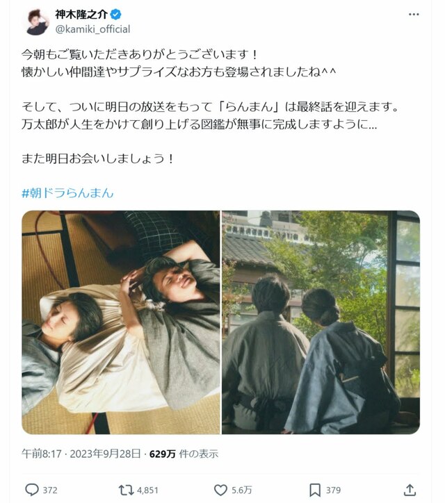 「心に残る朝ドライケメン」ランキング、岡田将生を抑えた「優しく熱血漢」役を演じた俳優は【トップ3】 ピンズバNEWS編集部 2025.3.6 テレビ&ラジオ テレビドラマ 俳優 (4/4ページ) 1ページ目から読む ■【画像】トップの演技派俳優、浜辺美波とのむつまじい夫婦ショット 神木隆之介は『らんまん』で主演、妻を演じた浜辺美波との息もぴったりだった。 神木隆之介 公式Xより この画像の記事を読む 1 2 3 4