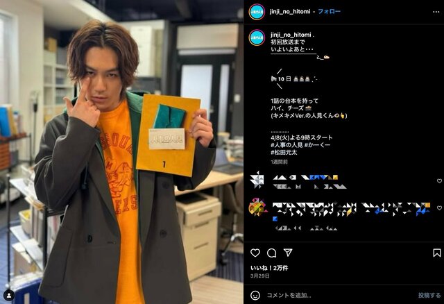 松田元太『人事の人見』は“失敗してもいいドラマ” フジ問題の逆風の中で“スタエンとCULEN”結びつきを重視した強かな将来戦略 ドラマライター・ヤマカワ 2025.4.8 テレビドラマ ジャニーズ (3/3ページ) 1ページ目から読む ■【画像】松田元太「目力ハンパない」キメキメポーズがの色気がヤバい『人事の人見』番宣ショット 俳優枠で覚醒なるか? ※画像は『人事の人見』公式インスタグラムアカウントより ■フジテレビ『人事の人見』公式サイト この画像の記事を読む 1 2 3