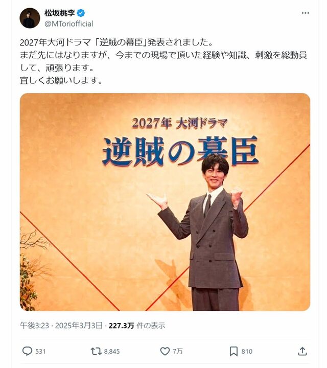 爆売れした「戦隊俳優」ランキング、横浜流星を抑えた「全世代的に知名度高」の存在感俳優は【トップ3】 ピンズバNEWS編集部 2025.5.1 俳優 (4/4ページ) 1ページ目から読む ■【画像】「爆売れ元戦隊俳優」トップ、大河主演大抜擢での笑顔ショット 松坂桃李は、2027年のNHK大河ドラマ『逆賊の幕臣』で主演を務めることが話題になっている。 松坂桃李 公式Xより この画像の記事を読む 1 2 3 4