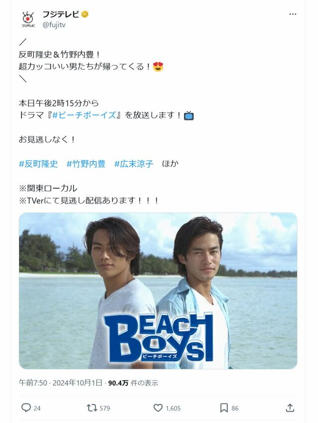 広末涼子の「最高ドラマ」ランキング、『龍馬伝』を抑えた「大ブレイクしたキッカケ」ドラマは【トップ3】 ピンズバNEWS編集部 2025.5.1 女優 俳優 (4/4ページ) 1ページ目から読む ■【画像】「広末涼子が最高nドラマ」トップ、主演2人のまぶしすぎるイケメンショット 広末涼子の初々しい演技も話題になった、反町隆史&竹野内豊主演ドラマ『ビーチボーイズ』。 フジテレビ公式Xより この画像の記事を読む 1 2 3 4