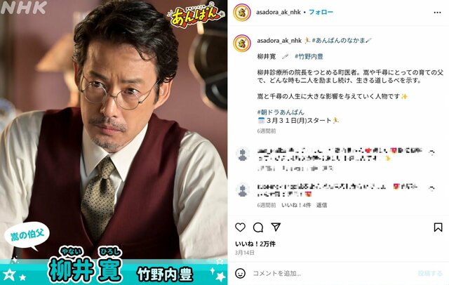 『あんぱん』出演「注目イケメン」ランキング、北村匠海を抑えた「朝ドラで見るのが新鮮」俳優は【トップ3】 ピンズバNEWS編集部 2025.5.7 俳優 (4/4ページ) 1ページ目から読む ■【画像】「『あんぱん』注目イケメン」トップの洗練ビジュアル 『あんぱん』で崇の叔父、柳井寛を演じている竹野内豊。甥たちの父親代わりとして、いつも寄り添う姿に共感を覚える視聴者も多い。 『あんぱん』公式インスタグラムより この画像の記事を読む 1 2 3 4