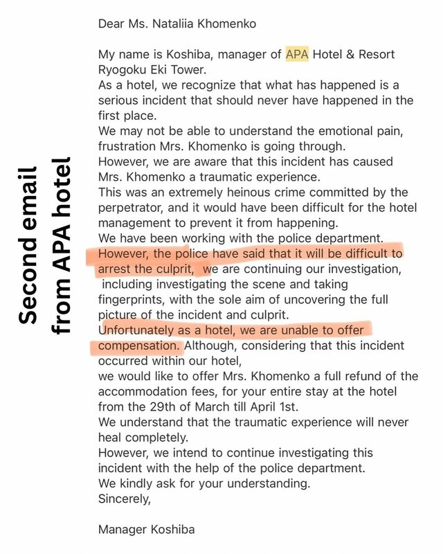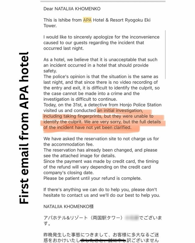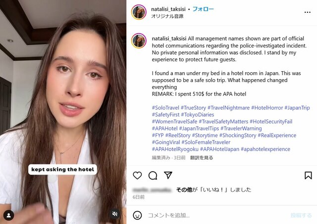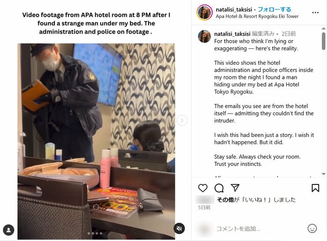 「ベッド下に男が」女性観光客がアパホテルでの恐怖体験訴え…アパ側は直撃に「事実関係不明」警察も捜査に出た“真偽の行方” ピンズバNEWS編集部 2025.5.3 国際・外交 (3/3ページ) 1ページ目から読む ■【画像】「ベッドの下に男が潜んでいた」恐怖体験が起きたとされる現場写真、警察も出動 ※画像は「@natalisi_taksisi」さんのインスタグラムより ※画像は「@natalisi_taksisi」さんのインスタグラムより アパホテル側とやり取りをしたという“証拠”のメール画面。 ※画像は「@natalisi_taksisi」さんのインスタグラムより ※画像は「@natalisi_taksisi」さんのインスタグラムより この画像の記事を読む 1 2 3