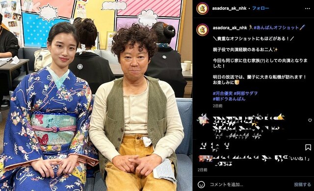 今田美桜『あんぱん』河合優実が圧倒的演技でヒロイン食い加速 戦中編の悲劇展開でまだまだ続く“ほぼ主役状態” ドラマライター・ヤマカワ 2025.5.5 テレビドラマ (3/3ページ) 1ページ目から読む ■【画像】河合優実がまさかの再共演『あんぱん』で『ふてほど』父親とおすまし2ショット 『不適切にもほどがある!』(TBS系)で父子を演じた阿部サダヲ(55)と共演することになった河合。残念ながらあの親子喧嘩はありません。 ※画像は『あんぱん』公式インスタグラムアカウントより ■NHK『あんぱん』公式サイト この画像の記事を読む 1 2 3