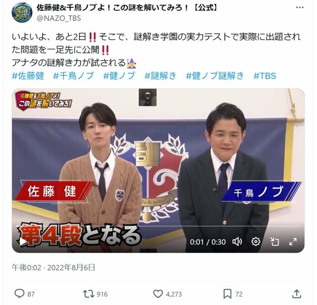 「親友なのが意外すぎる芸能人」ランキング、北川景子&イモトアヤコを抑えた「何もかも正反対」な2人は【トップ3】 ピンズバNEWS編集部 2025.5.12 お笑い 女優 俳優 (4/4ページ) 1ページ目から読む 【画像】「意外すぎる親友」親友トップ、「キャラが違う」ツーショット 佐藤健、千鳥のノブは、自宅を訪れるほどの仲良し。『佐藤健&千鳥ノブよ!この謎を解いてみろ!』でも仲の良さをうかがわせるやり取りが見られる。 『佐藤健&千鳥ノブよ!この謎を解いてみろ!』公式Xより この画像の記事を読む 1 2 3 4