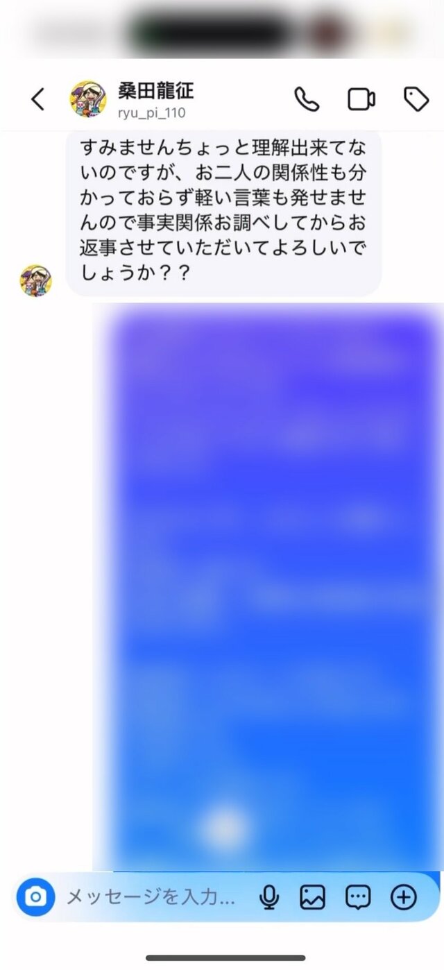 『令和の虎』がオーナーのホスト店で3度の暴力沙汰 被害女性が告白「対応途中で音信普通に……」 ピンズバNEWS編集部 2025.6.9 事件 (3/3ページ) 1ページ目から読む ■【画像】「事実関係お調べしてから」『令和の虎』と被害女性のやり取り ホストの被害に遭ったA子さん。インスタグラムのDMを通じてオーナーである桑田氏に助けを求めるも対応は冷たいものだった。 ※画像はA子さん提供 ※画像はA子さん提供 この画像の記事を読む 1 2 3