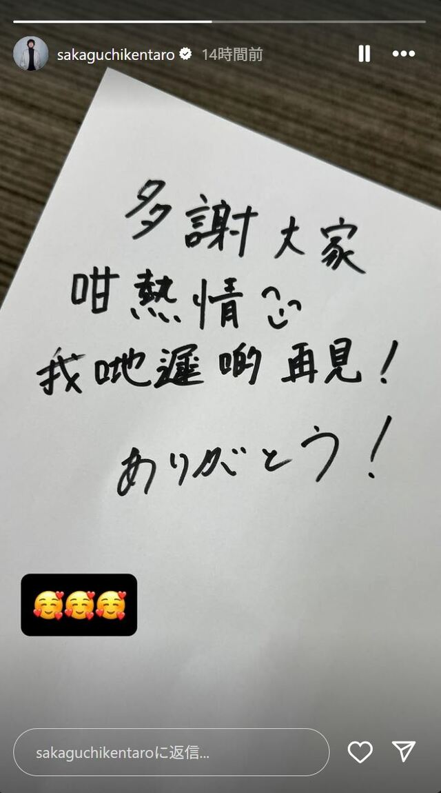 達筆手書き文が沸騰…坂口健太郎のアジア人気が急騰 不倫疑惑・田中圭が消滅気配のなか小栗旬社長を救うか ピンズバNEWS編集部 2025.6.7 テレビドラマ 女優 俳優 (4/4ページ) 1ページ目から読む ■【画像】“アジア人気急騰”坂口健太郎、ファンが沸騰した日本語&中国語「達筆手書き文」 坂口健太郎が自身のインスタグラムストーリーズにアップした日本語と中国語を交えた直筆で達筆なメッセージに《中国語でなんて愛》《直筆が温かい》と多くのファンが沸騰した。笑顔のイラストも可愛い。 ※画像は坂口健太郎の公式インスタグラムより この画像の記事を読む 1 2 3 4