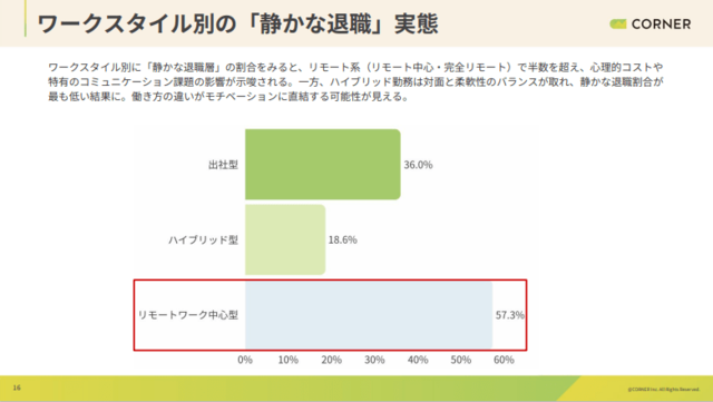 「出世に興味なし」「余計な仕事はしない」サラリーマンの約4割が実践する「静かな退職」 ピンズバNEWS編集部 2025.6.21 ライフ 仕事 (3/3ページ) 1ページ目から読む ■【画像】最新調査で判明した「静かな退職」の実態データ 株式会社コーナー(https://www.corner-inc.co.jp)が今年5月に行った調査で、「静かな退職」の最新実態が判明した。 従業員100名以上の企業に勤める正社員413名のうち、約4割が「静かな退職」状態にある(写真上)/ リモートワーク中心になると、約5割が「静かな退職」状態に(写真下)(いずれも株式会社コーナー『静かな対象と人事の認識ギャップ調査』より) この画像の記事を読む 1 2 3