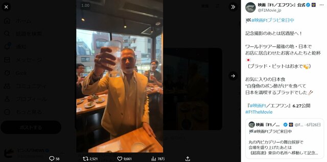 ブラッド・ピット、映画『F1』PRで来日中にロスの自宅が“空き巣被害”に ウラで拡散「居酒屋で日本人客とカンパイ」動画 ピンズバNEWS編集部 2025.6.28 俳優 国際・外交 (3/3ページ) 1ページ目から読む ■【画像】周囲の日本人客と「乾杯!」立ち飲み居酒屋に馴染むブラッド・ピット プロモーションツアーの最終日、大井町の立ち飲み居酒屋で和食を堪能したブラッド・ピット。グラスの中身は水だという。《箸の使い方も上手で、Hollywood starがお店に馴染んでますね》《お箸キレイに使ってはる》など、箸の使い方にも注目が集まった。 ※画像は映画『F1/エフワン』公式Xより この画像の記事を読む 1 2 3
