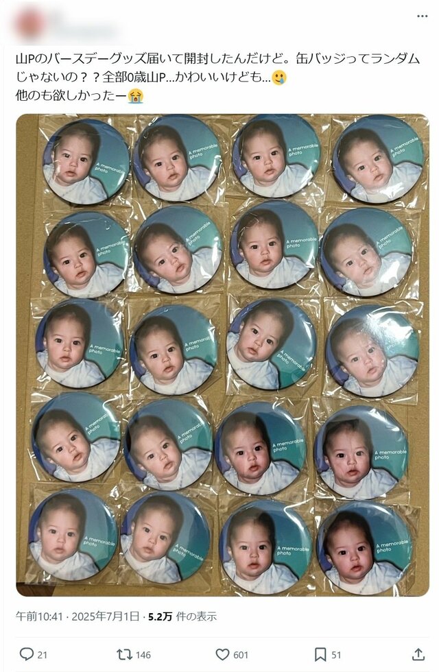 ファンクラブ会員向けに発売された山下智久のランダム缶バッジ。ランダムなので、複数枚買えば違う種類のデザイン缶バッジが届く可能性が高くなると思いきや、まさかの「すべて同じだった」という報告が続出している。