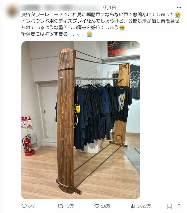 「キツすぎる」タワーレコードで展示された“和楽器ハンガーラック”が炎上→撤去 担当者「伝統文化に対する配慮に欠けていた」 ピンズバNEWS編集部 2025.7.8 (3/3ページ) 1ページ目から読む ■【画像】「まるで公開処刑…」ネット炎上した“和楽器を使ったハンガーラック” タワーレコードにて、Tシャツをディスプレイするために造られた"箏を使ったラック”。再利用のあり方について、さまざまな議論をよんだ。 ※Xより この画像の記事を読む 1 2 3