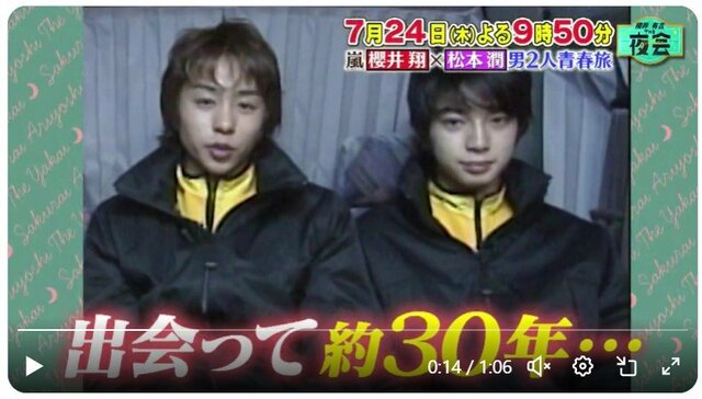 松本潤×櫻井翔「かわいい!!」24年前動画も沸騰 下半期「大野智&5人」大争奪戦確定、嵐共演の凄い数字 ピンズバNEWS編集部 2025.7.24 テレビ&ラジオ エンタメ ジャニーズ (3/3ページ) 1ページ目から読む ■【画像】松本潤×櫻井翔「かわいい!!」24年前姿も沸騰、胸キュンな嵐のニ人旅姿 『櫻井・有吉THE夜会』で二人旅を行なう松本潤と櫻井翔。予告では、24年前の2人の姿も紹介され、《かわいい!!!!!たのしみです》《地上波で翔潤デート()?とか画面割れるぐらいの衝撃度だろ…》といった歓喜する声が多く寄せられている。 ※画像は『櫻井・有吉THE夜会』公式Xより ※画像は『櫻井・有吉THE夜会』公式YouTubeより この画像の記事を読む 1 2 3