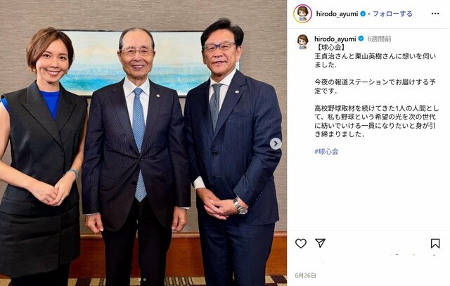 伝説のバンドメンバーも言及 テレ朝・井澤健太朗アナの広陵高校「暴力事案」炎上発言の背景は?元テレ朝Pに聞いた ピンズバNEWS編集部 2025.8.15 テレビ&ラジオ エンタメ (3/3ページ) 1ページ目から読む ■【画像】テレ朝“甲子園番組担当”美人アナ「世界のホームラン王」との貴重ショット 『熱闘甲子園』(テレビ朝日系)のキャスターなど、テレ朝で甲子園番組を担当している元朝日放送テレビアナウンサーのヒロド歩美(33)。必然的に野球関係の企画に呼ばれることが多く、世界のホームラン王・王貞治氏(85)、2023年のWBCで監督を務めた栗山英樹氏(64)との3ショットを撮ったことも。 ※画像はヒロドの公式インスタグラムより この画像の記事を読む 1 2 3