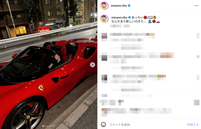 「またELLYの車」三代目ELLYと熱愛の南りほ、フェラーリ納車報告で順調交際アピール 「また小顔なった」の声も ピンズバNEWS編集部 2025.8.17 エンタメ (2/2ページ) 1ページ目から読む ■【画像】「またELLYの車」「また小顔なった」南りほ、フェラーリ納車報告で順調交際アピール 《またELLYの車》といったコメントも書き込まれていたが、南は3つの笑顔の絵文字で返信。相変わらず交際は順調なようだ。 ※画像は南りほのインスタグラムより、以下同 この投稿をInstagramで見る 南りほ minami riho(@minami.riho)がシェアした投稿 この画像の記事を読む 1 2