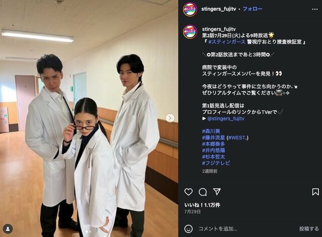 森川葵『スティンガース』今期で一番ちょうどいいドラマ 「毎回スッキリ終わる」“背景描かず”気軽さポップさに徹した作りで配信が好調 ドラマライター・ヤマカワ 2025.8.19 テレビドラマ (3/3ページ) 1ページ目から読む ■【画像】藤井流星・森川葵・井内悠陽、白衣姿が似合いすぎな『スティンガース』コスプレ写真 毎回、披露されるコスプレも楽しい! ※画像はスティンガース公式インスタグラムアカウントより ■フジテレビ『スティンガース 警視庁おとり捜査検証室』公式サイト この画像の記事を読む 1 2 3