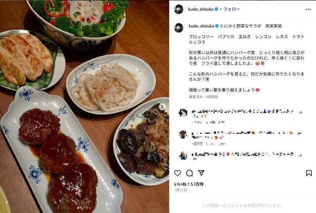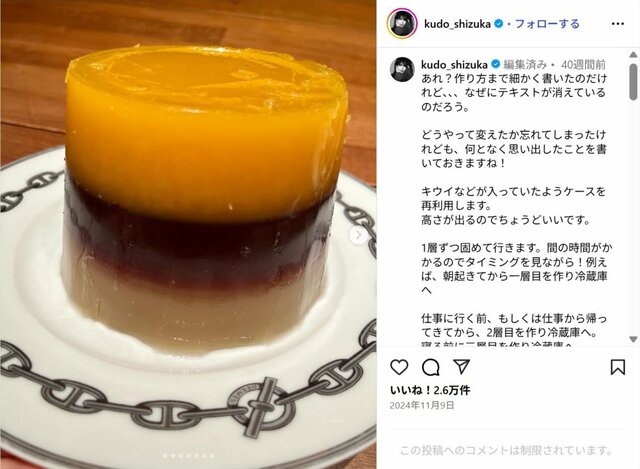 主婦が「作るのが面倒な料理」ランキング、冷やし中華を超えた“具材も工程も多い”人気総菜は【トップ3】 ピンズバNEWS編集部 2025.8.23 ライフ (4/4ページ) 1ページ目から読む ■【画像】工藤静香が作ったエルメスの皿に盛られた“芸術的すぎる”ビジュアルのゼリー 木村拓哉の妻である工藤静香は、自身も歌手として多忙だが、インスタグラムで凝った料理をたびたび披露している。昨年はエルメスの皿に盛った、手間をかけた3層ゼリーを投稿。最近も夏バテを吹き飛ばしそうな手のかかったり料理を披露していた。 工藤静香 公式インスタグラムより この画像の記事を読む 1 2 3 4