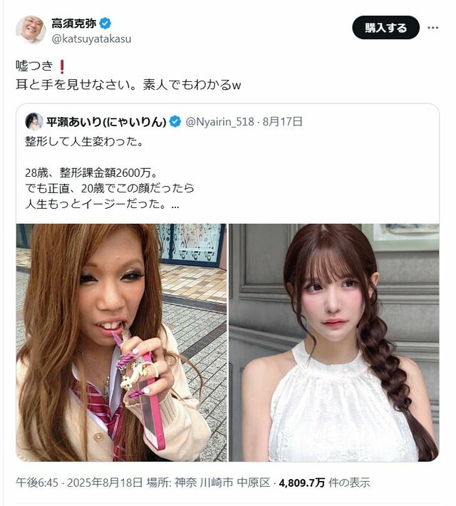美女の“顔面変化写真”に高須院長が「嘘つき!」“整形費用2600万円モデル”平瀬あいりが明かす本音「何言っても繰り返し」 ピンズバNEWS編集部 2025.8.25 (3/3ページ) 1ページ目から読む ■【画像】「嘘つき!」高須院長が糾弾した2600万円整形モデルのアフター写真 整形ビフォーアフター写真を投稿した平瀬あいりに対し、《嘘つき!》と糾弾した高須院長。耳と手に言及しているのは、「一方の写真ずつにしか含まれておらず、"比較”ができないからかな」と平瀬さんは話していた。 高須克弥院長の公式Xより この画像の記事を読む 1 2 3