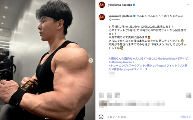 「顔よりでかいやんけ」「胴体やん」“おバカ&筋肉タレント”横川尚隆、超巨大化した上腕筋に驚きの声 ピンズバNEWS編集部 2025.9.1 エンタメ (2/2ページ) 1ページ目から読む ■【画像】「顔よりでかいやんけ」「胴体やん」横川尚隆、巨大化した上腕筋 《顔よりでかいやんけ》《胴体やん》などと、ファンが驚くのも無理がないほどの鍛え上げられたボディ。体調に気をつけて大会に向けてがんばってほしい。 ※画像は横川尚隆のインスタグラムより、以下同 この投稿をInstagramで見る Naotaka Yokokawa/横川尚隆(@yokokawa_naotaka)がシェアした投稿 この画像の記事を読む 1 2