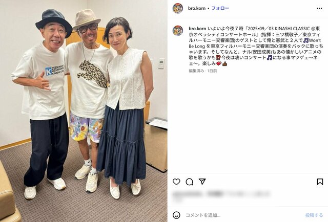 「元気で何よりでした」盟友ディレクターの投稿で石橋貴明の復帰期待高まる “復活気配”も…近年見せていた「圧巻結果と誠実さ」 ピンズバNEWS編集部 2025.9.6 テレビ&ラジオ お笑い ジャニーズ (4/4ページ) 1ページ目から読む ■【画像】「元気で何よりでした」“石橋貴明の盟友”と木梨憲武&美人妻の貴重な3ショット とんねるずの石橋貴明と木梨憲武の盟友、バブルガム・ブラザーズのブラザー・コーン(69)が9月4日までにインスタグラムを更新し、木梨と安田成美(58)夫妻とのスリーショットを投稿。結婚31年を迎えた今も夫婦仲が良好なことをあらためてうかがわせた。 ※画像はブラザー・コーンの公式インスタグラムより この画像の記事を読む 1 2 3 4