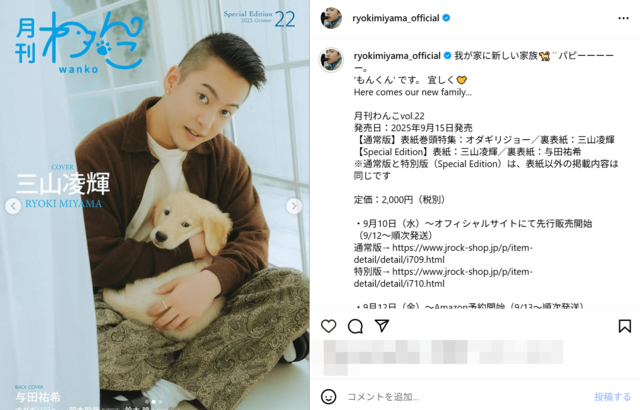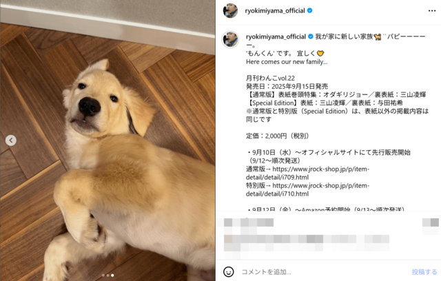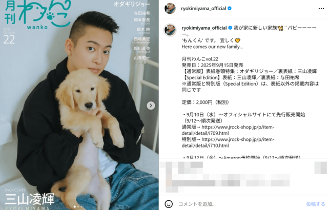 「成長が楽しみ」趣里と結婚のBE:FIRST三山凌輝、結婚後初近影と“新しい家族”が寝転ぶ無防備ショットを公開 ピンズバNEWS編集部 2025.9.11 アーティスト エンタメ 俳優 (2/2ページ) 1ページ目から読む ■【画像】「成長が楽しみ」趣里と結婚の三山凌輝、結婚後初近影と“新しい家族”が寝転ぶ無防備姿 趣里と結婚後初の近影と“新しい家族”写真を公開した三山凌輝。今回の投稿には《もんくんの成長が楽しみですね》《家族時間を満喫してね》との反応もあがっているが、趣里と三山の第一子誕生も待ち遠しい。 ※画像は三山凌輝のインスタグラムより、以下同 この投稿をInstagramで見る 三山 凌輝(@ryokimiyama_official)がシェアした投稿 【この画像の記事に戻る】 1 2