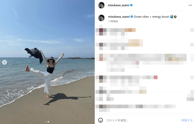 水川の夏らしいショットには《あさみさん、ほんと世界一海が似合う》《笑顔最高です ブギウギのポーズですね》といった反応もあがっている。ジャンプしているショットから感じられる、エネルギッシュなところが水川の魅力。