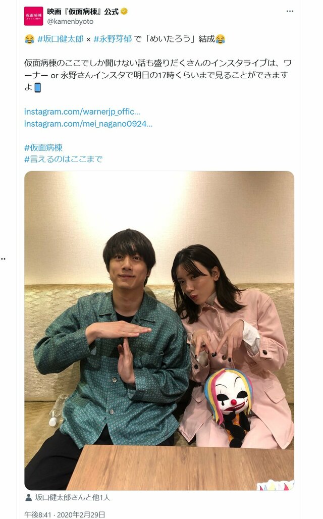 坂口健太郎と永野芽郁、過去の“イチャイチャ動画”掘り起こされるも「永野は三角関係を知らなかった」 ピンズバNEWS編集部 2025.9.11 女優 俳優 (3/3ページ) 1ページ目から読む ■【画像】「裏を想像させちゃうのがグロい」坂口健太郎と永野芽郁の“近すぎる”番宣2ショット 文春によれば、永野芽郁の事務所は、坂口健太郎と一時期交際していたことを認めたという。SNSでは『仮面病棟』公開時のプロモーション活動においても、2人の仲よさげな雰囲気を示す画像やインスタライブの動画が掘り起こされ、拡散されている。 ※画像は『仮面病棟』公式Xより この画像の記事を読む 1 2 3