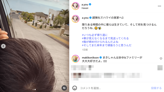 「ボーイズ達可愛すぎる」浜崎あゆみ、息子とのハワイ旅行動画に反響「声かわいすぎてめっちゃ癒される」 ピンズバNEWS編集部 2025.9.17 アーティスト エンタメ (2/2ページ) 1ページ目から読む ■【画像】「ボーイズ達可愛すぎる」浜崎あゆみ、息子とのハワイ旅行動画 今回の投稿に上がった《ボーイズ達可愛すぎる》《声かわいすぎてめっちゃ癒される》というファンからの声。ライブもママも全力投球な浜崎に、ファンの視線は熱くなる一方だ。 ※画像は浜崎あゆみのインスタグラムより、以下同 この投稿をInstagramで見る ayumi hamasaki(@a.you)がシェアした投稿 この画像の記事を読む 1 2