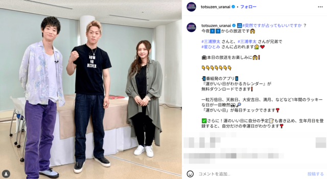 「完全に黒木メイサじゃん」デート報道・三浦孝太、3年半前の占いが沸騰…“親子絶縁”不穏予言にSNS騒然 ピンズバNEWS編集部 2025.9.28 女優 エンタメ その他イケメン (2/2ページ) 1ページ目から読む ■【画像】「完全に黒木メイサじゃん」未来の“親子絶縁”不穏予言されたときの三浦孝太と占い師 “親子絶縁”予言も…3年半前の占いが《完全に黒木メイサじゃん》と沸騰中の三浦孝太。偶然の一言では片付けられないような一致具合に、ファンがざわつくのも無理もないのかも。 ※画像は『突然ですが占ってもいいですか?』のインスタグラムより、以下同 この投稿をInstagramで見る フジテレビ『突然ですが占ってもいいですか?』(@totsuzen_uranai)がシェアした投稿 この画像の記事を読む 1 2