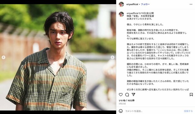 妻夫木聡、窪田正孝、広瀬すず、永山瑛太といった一流俳優が集結した映画『宝島』。同作に出演した19歳の若手俳優・栄莉弥は彼らに勝るとも劣らない輝きを放っており、《宝島の栄莉弥くん、最初に登場した瞬間に「なんていい佇まいの男の子なんだ···」とそれからずっと見惚れる。まさに島の男の子なナチュラルな雰囲気、それだけでも充分満足してたら芝居もいい··!》などと注目を集めた。
