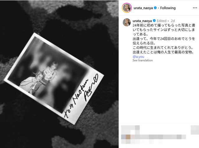 「俺の人生で最高の宝物」元AAA浦田直也、浜崎あゆみの47歳誕生日に秘蔵ショット&熱烈メッセージ公開…“匂わせ”説の過去も ピンズバNEWS編集部 2025.10.4 アーティスト エンタメ (2/2ページ) 1ページ目から読む ■【画像】「俺の人生で最高の宝物」浦田直也、浜崎あゆみ47歳誕生日に秘蔵ショット 《俺の人生で最高の宝物》浜崎あゆみの47歳誕生日に秘蔵ショット&熱烈メッセージを公開した浦田直也。“交際匂わせ”が指摘された噂の過去も、もはや本人たちにとっては懐かしい記憶の1つになっているのかも。 ※画像は浦田直也のインスタグラムより、以下同 この投稿をInstagramで見る 浦田直也(@urata_naoya)がシェアした投稿 ※画像は浜崎あゆみのインスタグラムより、以下同 この投稿をInstagramで見る ayumi hamasaki(@a.you)がシェアした投稿 この画像の記事を読む 1 2