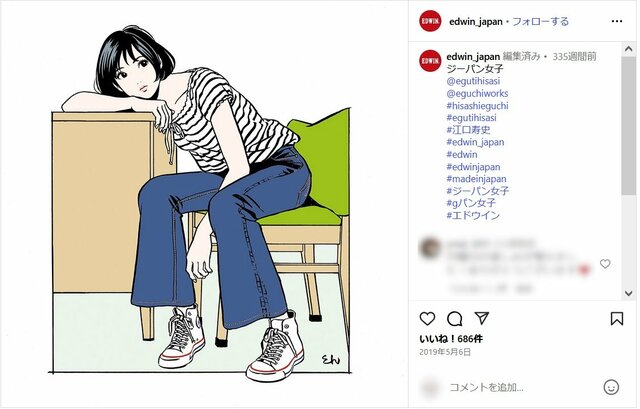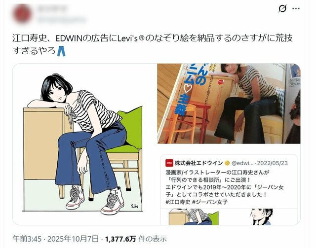 江口寿史氏“トレパク騒動”「EDWINコラボにリーバイス着用写真を使用」疑惑にネット絶句、両社を直撃 ピンズバNEWS編集部 2025.10.9 ライフ (3/3ページ) 1ページ目から読む ■【画像】「さすがに荒技すぎる」リーバイス着用のモデルと酷似したEDWINの広告の比較画像 トレパク騒動が止まらない江口寿史氏のイラスト。著作も多いことから、ネット上では“検証”作業が止まらない事態に発展している。 ※画像はXより ※画像はXより ※画像はEDWINの公式インスタグラムより ※画像はEDWINの公式Xより この画像の記事を読む 1 2 3