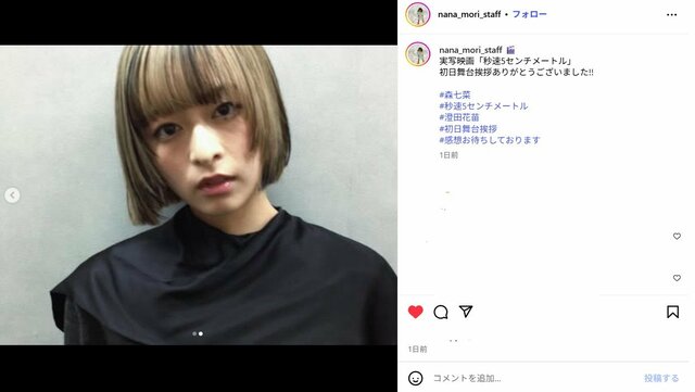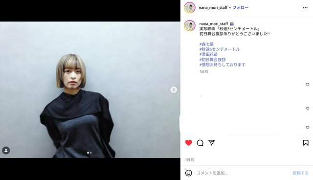 黒髪のイメージが強い森七菜だが、マネジャーのインスタグラムにて金髪ショートヘアに激変したショットを投稿。《金髪の森七菜ちゃん、まるで別人みたい透明感はそのままで、新しい魅力が増してる》《最新の?金髪パッツンボブな森七菜ちゃんめっちゃ可愛いのだが》《お前かわいすぎる》といった声が多く寄せられている。