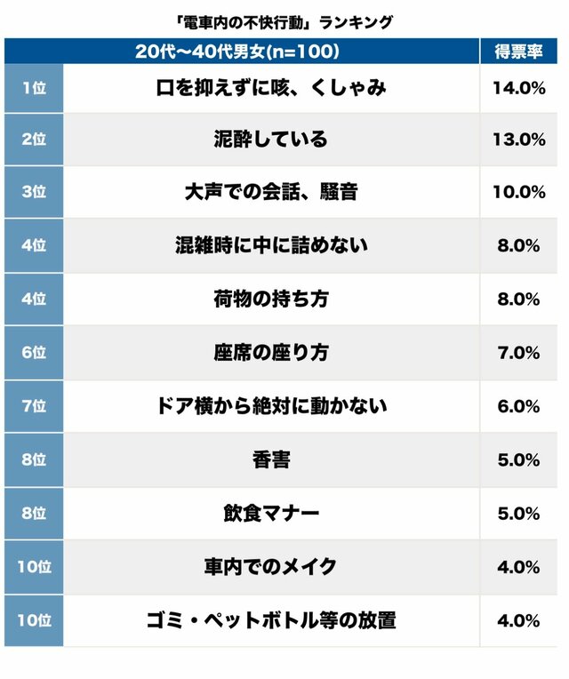 狭い車内では周囲の乗客に飛沫が直接かかる可能性が高く、感染症への不安を与えてしまう。これからの季節はインフルエンザなどの流行もあるため、より厳しいマナーが求められそう。