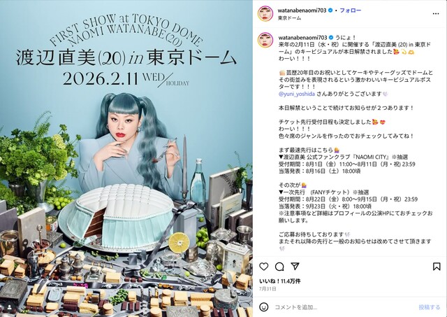 現在はアメリカを拠点に活動する渡辺だが、2026年2月には芸人で初の東京ドーム公演「渡辺直美(20)in 東京ドーム」を開催することも話題になっている。