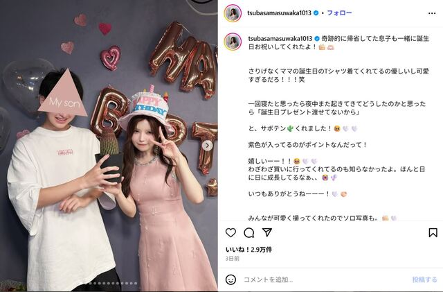 益若は、「奇跡的に帰省してた息子も一緒に誕生日お祝いしてくれた」と、17歳になる息子とのツーショットも披露。ガーリーなピンクワンピース姿でほほ笑む益若の可憐なビジュアルは、《40歳に全然見えない》《毎年若返ってる》《息子さんとのツーショットも素敵》《40代とか信じられへん》などフォロワーから絶賛されていた。