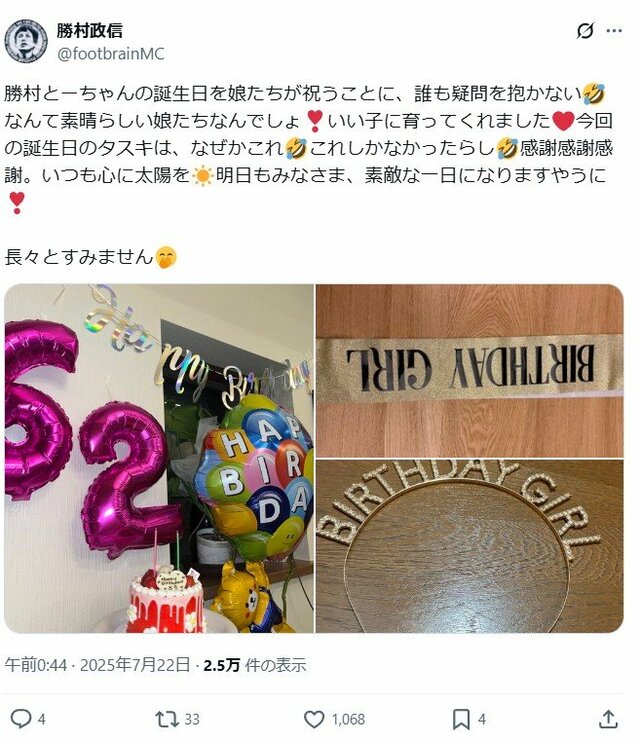 10月23日発売の『女性セブン』(小学館)に不倫スキャンダルが報じられた勝村政信。3か月前の7月22日には、娘に62歳の誕生日をお祝いしてもらったことを自身のXで報告していた。女性との不倫関係が終了して2か月ほどの時期か。勝村は《勝村とーちゃんの誕生日を娘たちが祝うことに、誰も疑問を抱かない なんて素晴らしい娘たちなんでしょ》と綴っている。