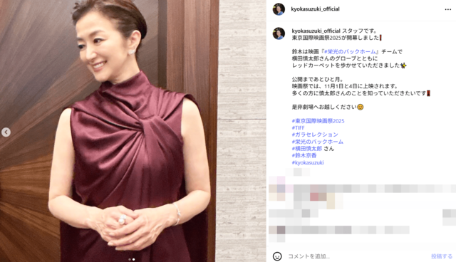 出演映画『栄光のバックホーム』関係者の集合写真でも、鈴木の凛とした姿は際立っている。常に“一流女優・鈴木京香”であったという。