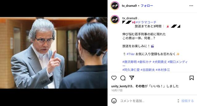 唐沢寿明は今期、ドラマ『コーチ』(テレビ東京系)で主演しているが、長髪の白髪と眼鏡という姿で、これまでの唐沢のイメージからガラリと変化した役を演じている。