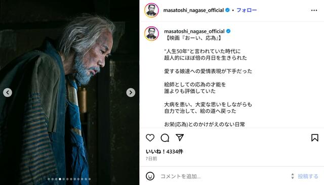 永瀬正敏は10月22日にインスタグラムで、出演した長澤まさみ主演映画『おーい、応為』でのビジュアルを公開。永瀬は同映画で、長澤演じるヒロインの父親・葛飾北斎を演じているが、公開された写真の永瀬はボサボサの白髪頭、白髪のヒゲという老け作りをしており、フォロワーからは《永瀬さんじゃないみたい!》《老いのリアルさに慄きました》《激渋》など驚きの声があがっていた。