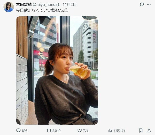 山本由伸の大ファン・本田望結が豪快飲み姿を披露「今日飲まなくていつ飲む」、過去には“ハート72個”発信も ピンズバNEWS編集部 2025.11.5 女優 (2/2ページ) 1ページ目から読む ■【画像】大人になった本田望結がニット姿で披露した豪快な飲みっぷり、過去にはファンから“山本由伸匂わせ”指摘も 俳優でフィギュアスケータ―の本田望結(21)が11月2日、Xを更新し豪快な飲みっぷりを披露した。 ※画像は本田望結のXより ※画像は本田望結のインスタグラムより この画像の記事を読む 1 2