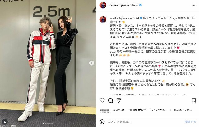 俳優の藤原紀香(54)が11月10日までにインスタグラムを更新。舞台ミュージカル『新テニスの王子様』The Fifth Stageに跡部景吾の母親・跡部瑛子役として、特別映像で出演中の彼女は、息子・景吾役の高橋怜也(29)との2ショット写真を公開した。藤原の衰えぬ美貌&スタイルにファンからは《美しすぎて言葉でどう表現したらいいか…!》《スタイル完璧すぎる〜》などの声が上がった。