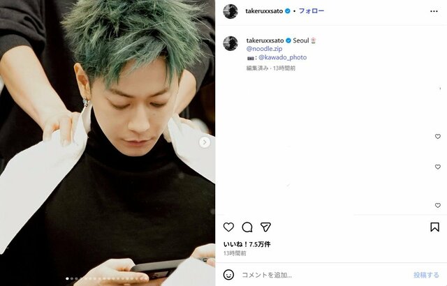 インスタグラムでグリーンヘアーおでこ出しのヘアスタイルを披露した佐藤健。