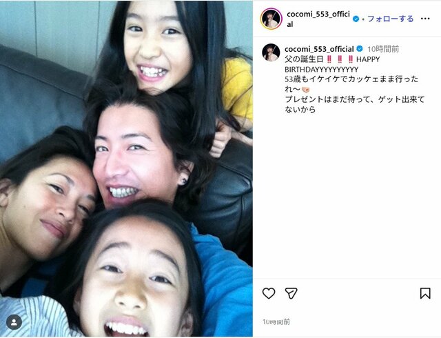 11月13日、歌手で俳優の木村拓哉が53歳の誕生日を迎えた。これを受けて、木村と歌手・工藤静香の長女でモデル・フルート奏者のCocomi、次女でモデル・俳優のKoki,がインスタグラムを更新した。