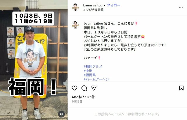 発端となったのは10月8日と9日に福岡県で売り上げた約160万円とレジにあった釣り銭の準備金がT社の口座に振り込まれなかったとされることだが、その日も斉藤はインスタグラムで告知活動をしていた。
