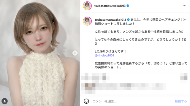 益若つばさは今回のショートヘアについて《女性っぽくもあり、メンズっぽさもある中性感を目指しました》と明かしていたが、《いくつになってもつーちゃんが世界で一番お姫様》《可愛すぎる 唯一無二の綺麗さで素敵です》と驚くファンも。透明感たっぷりでよく似合っている。
