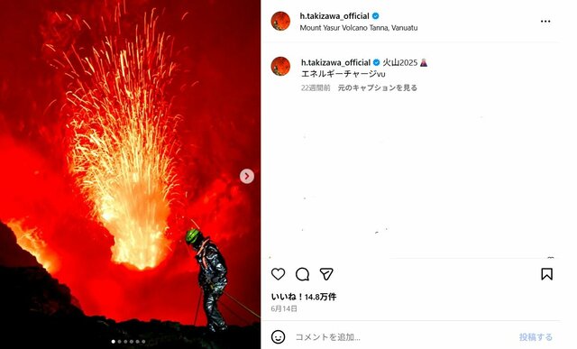 ■【画像】「映像NGか」滝沢氏、“真っ赤”超ド迫力火山をバックにした衝撃的近影「迫力がすごい」