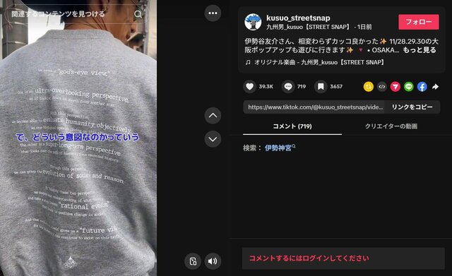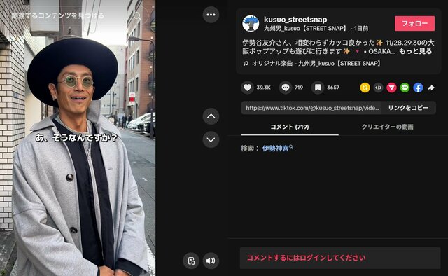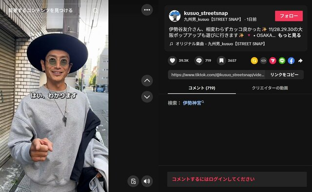 俳優の伊勢谷友介(49)が11月17日、シンガーソングライター・九州男(47)のTikTok『STREET SNAP』に登場。「神の視点」をテーマにした奇抜ファッションを紹介し、そのメッセージを通して伝えたい想いを口にした。