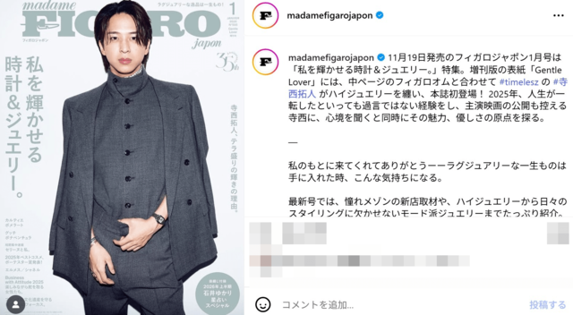 「どこの王族かと」timelesz寺西拓人、高貴なタートルネック×スーツ姿が「神スタイリング」と大好評 ピンズバNEWS編集部 2025.11.20 エンタメ (2/2ページ) 1ページ目から読む ■【画像】「どこの王族かと」timelesz寺西拓人、高貴なタートルネック×スーツ姿 高貴なタートルネック×スーツ姿が《どこの王族かと》《神スタイリング》と大好評のtimelesz寺西拓人。次なるステップは、“GP帯連ドラレギュラー出演”を通じての知名度アップか。 ※画像は『フィガロジャポン』のインスタグラムより、以下同 この投稿をInstagramで見る フィガロジャポン(@madamefigarojapon)がシェアした投稿 この画像の記事を読む 1 2