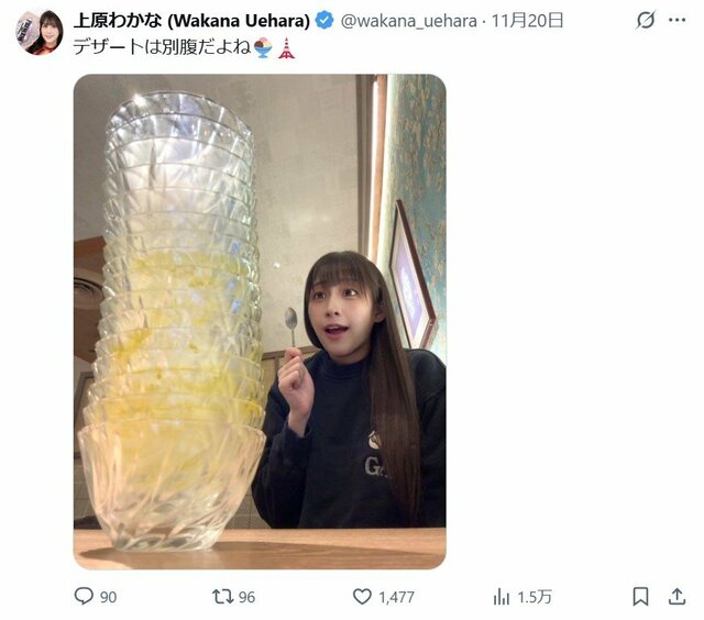 「デザートのスカイツリー」細身の大食い美女レスラーの“別腹”に騒然、桁外れの食べっぷりを公開 ピンズバNEWS編集部 2025.11.25 テレビ&ラジオ 女性アイドル エンタメ その他スポーツ (2/2ページ) 1ページ目から読む ■【画像】「レベルが桁外れ」大食い美女レスラー上原わかなが披露した豪快な食べっぷり 大食いタレント・プロレスラーの上原わかな(29)が11月24日までにXを更新し、見事な食べっぷりを披露。16皿のデザートをたいらげ、ファンからは《いつも別腹のレベルが桁外れなのよ》《デザートのスカイツリーや~》《デザートの皿でそれやる人見たことない!》といった驚きの声が寄せられた。 ※画像は上原わかなのXより この画像の記事を読む 1 2