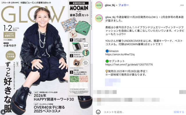 「いくつになっても可愛い」来年還暦の小泉今日子、“イケイケ”ヴィンテージスタイルで弾ける笑顔&不変美貌を披露 ピンズバNEWS編集部 2025.11.27 女優 アーティスト エンタメ (2/2ページ) 1ページ目から読む ■【画像】「いくつになっても可愛い」小泉今日子、“イケイケ”ヴィンテージスタイルで弾ける笑顔&不変美貌 “イケイケ”ヴィンテージスタイルで弾ける笑顔&不変美貌を披露した小泉今日子。自然体でありながら《いくつになっても可愛い》その姿に、多くのファンが勇気をもらっているはずだ。 ※画像は『GLOW』のインスタグラムより、以下同 この投稿をInstagramで見る GLOW(グロー)(@glow_tkj)がシェアした投稿 この画像の記事を読む 1 2